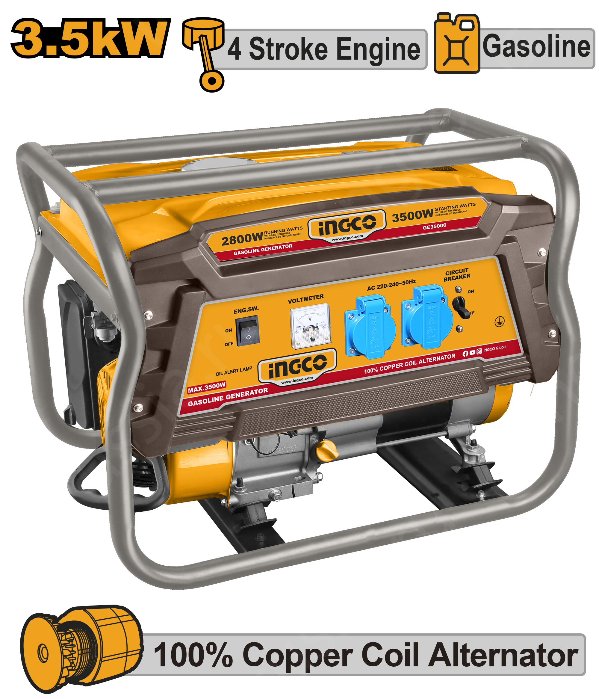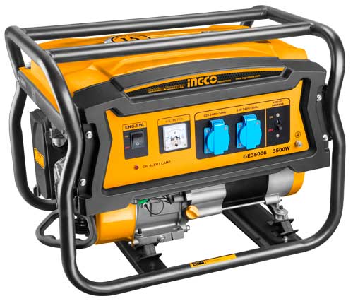 Бензиновый однофазный генератор INGCO GE35006 рассчитан на использование в качестве аварийного или автономного источника электроэнергии для питания маломощных бытовых электроприборов и электроинструмента.