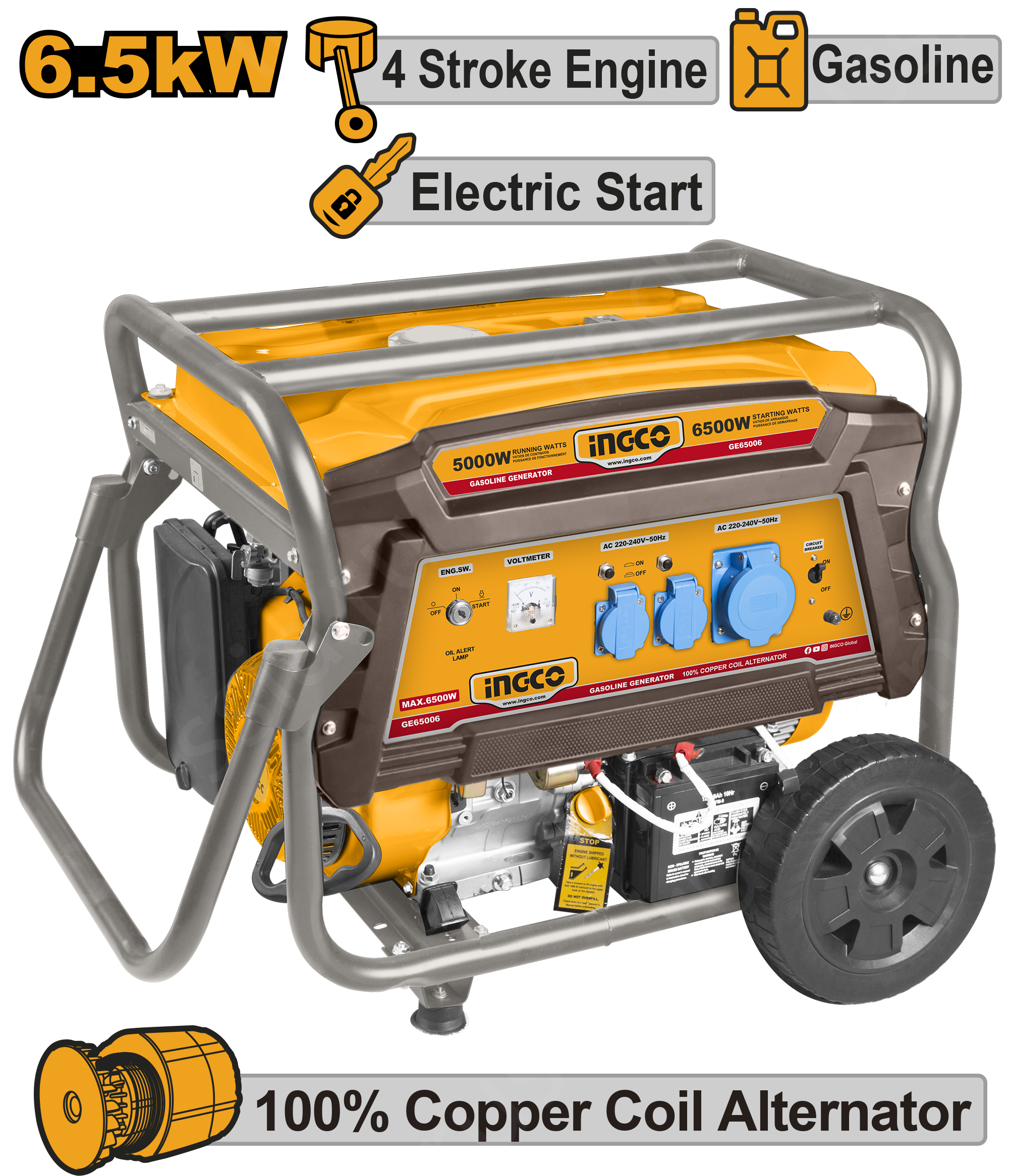 Бензиновый генератор 220В 6,5 кВт INGCO GE65006 INDUSTRIAL рассчитан на использование в качестве аварийного или автономного источника электроэнергии для питания маломощных бытовых электроприборов и электроинструмента.