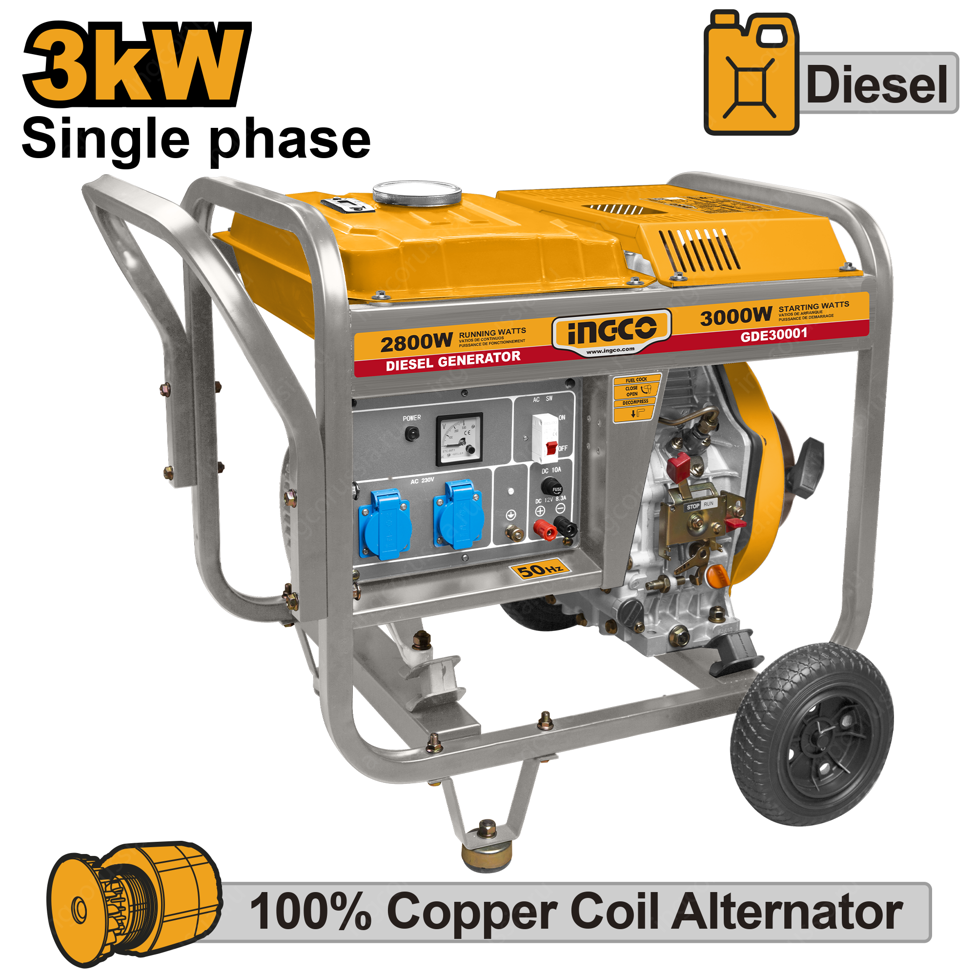 Дизельный генератор 220В 3,0 кВт INGCO GDE30001 INDUSTRIAL рассчитан на использование в качестве аварийного или автономного источника электроэнергии для питания маломощных бытовых электроприборов и электроинструмента.