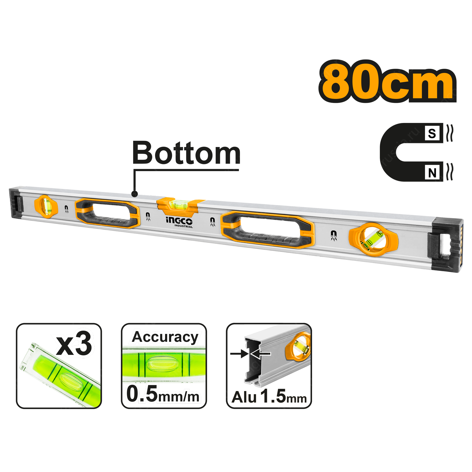 <p>Строительный алюминиевый уровень INGCO HSL38080M INDUSTRIAL инструмент для выявления отклонения поверхности по горизонтали и вертикали. Конструкция выполнена из прочного алюминиевого сплава толщиной 1,5 мм и имеет анодированное покрытие, благодаря чему срок службы инструмента выше. Точность измерения - 0,5 мм на метр. Специальные встроенные заглушки по бокам защищают уровень от повреждения. Оборудован четырьмя магнитами.</p> <p>Длина: 80 см.</p>