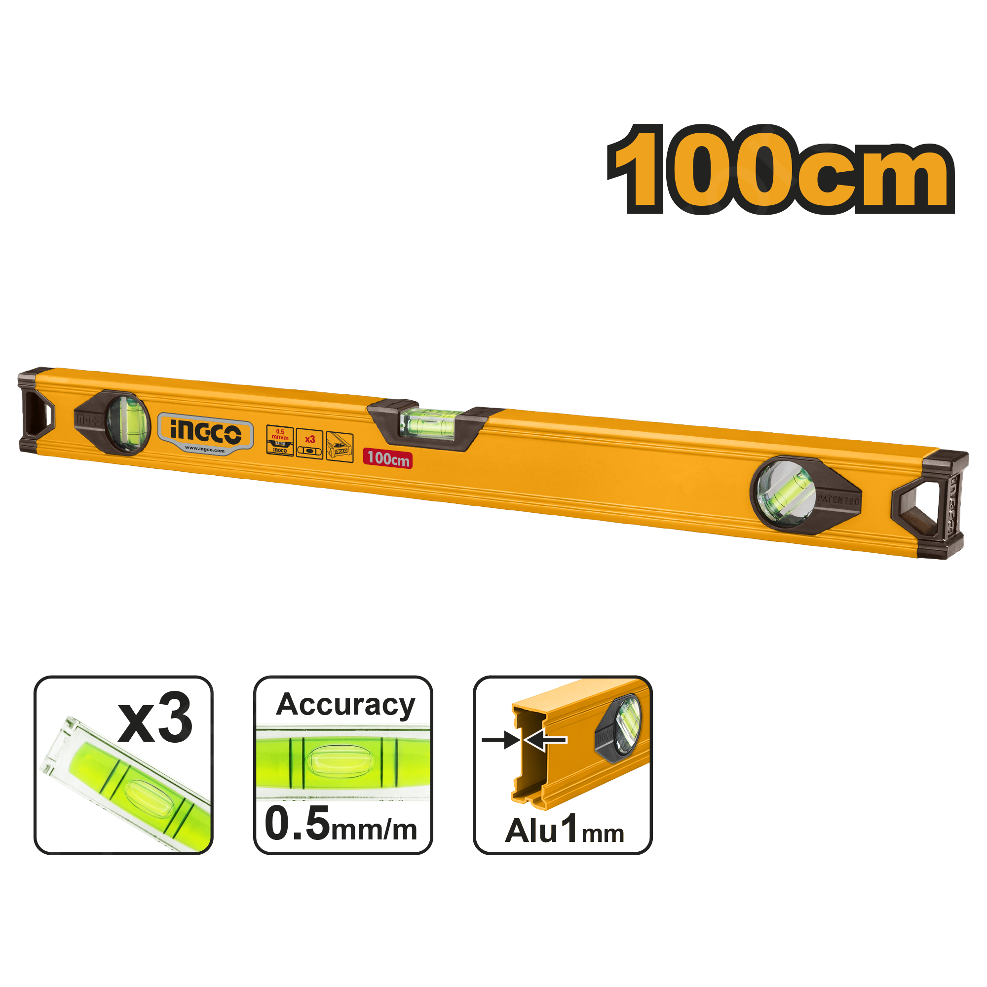 Строительный алюминиевый уровень INGCO HSL18100 инструмент для выявления отклонения поверхности по горизонтали и вертикали. Конструкция выполнена из прочного алюминиевого сплава толщиной 1 мм. Специальные встроенные заглушки по бокам защищают уровень от повреждения.