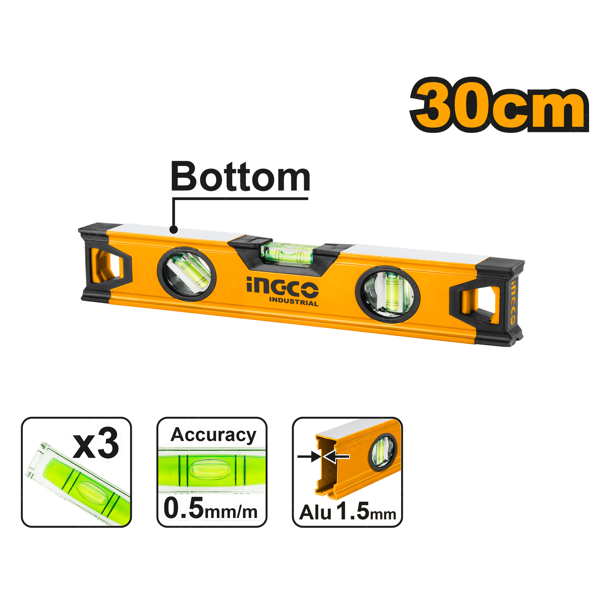Строительный алюминиевый уровень INGCO HSL08030 INDUSTRIAL оснащен 3 глазками. Конструкция выполнена из прочного алюминиевого сплава толщиной 1,5 мм и имеет анодированное покрытие, благодаря чему срок службы инструмента выше. V-образной слот для измерения объектов с круглой поверхностью. Специальные встроенные заглушки по бокам защищают уровень от повреждения.