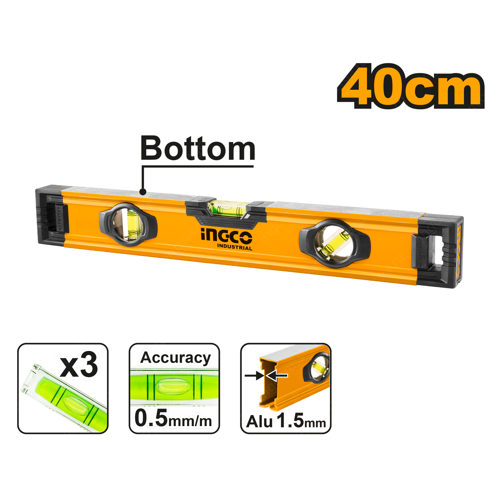 Строительный алюминиевый уровень INGCO HSL08040 INDUSTRIAL оснащен 3 глазками.