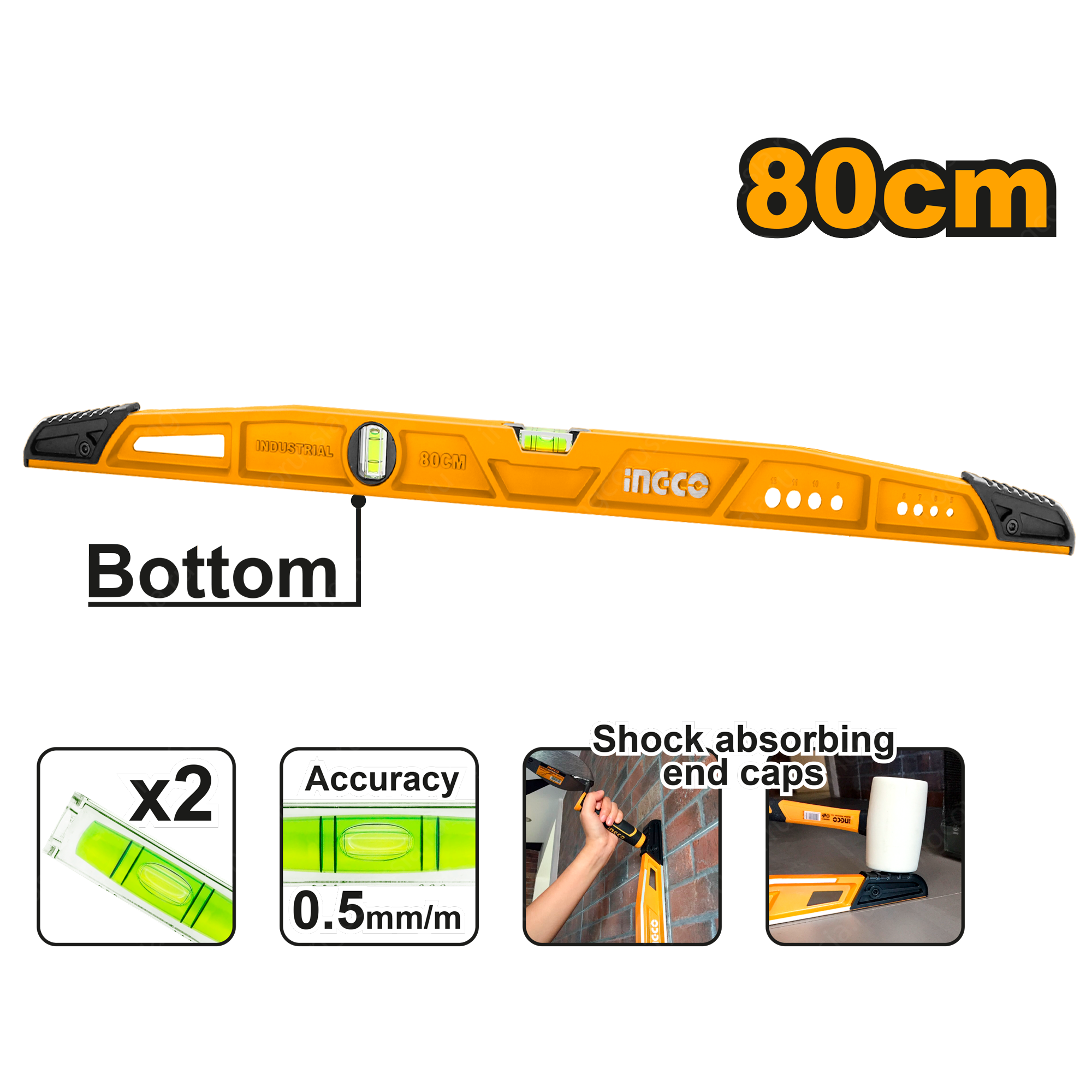 Уровень усиленный 80 см INGCO HBSL08060 INDUSTRIAL оснащен двумя глазками для выявления отклонения поверхности по горизонтали и вертикали.