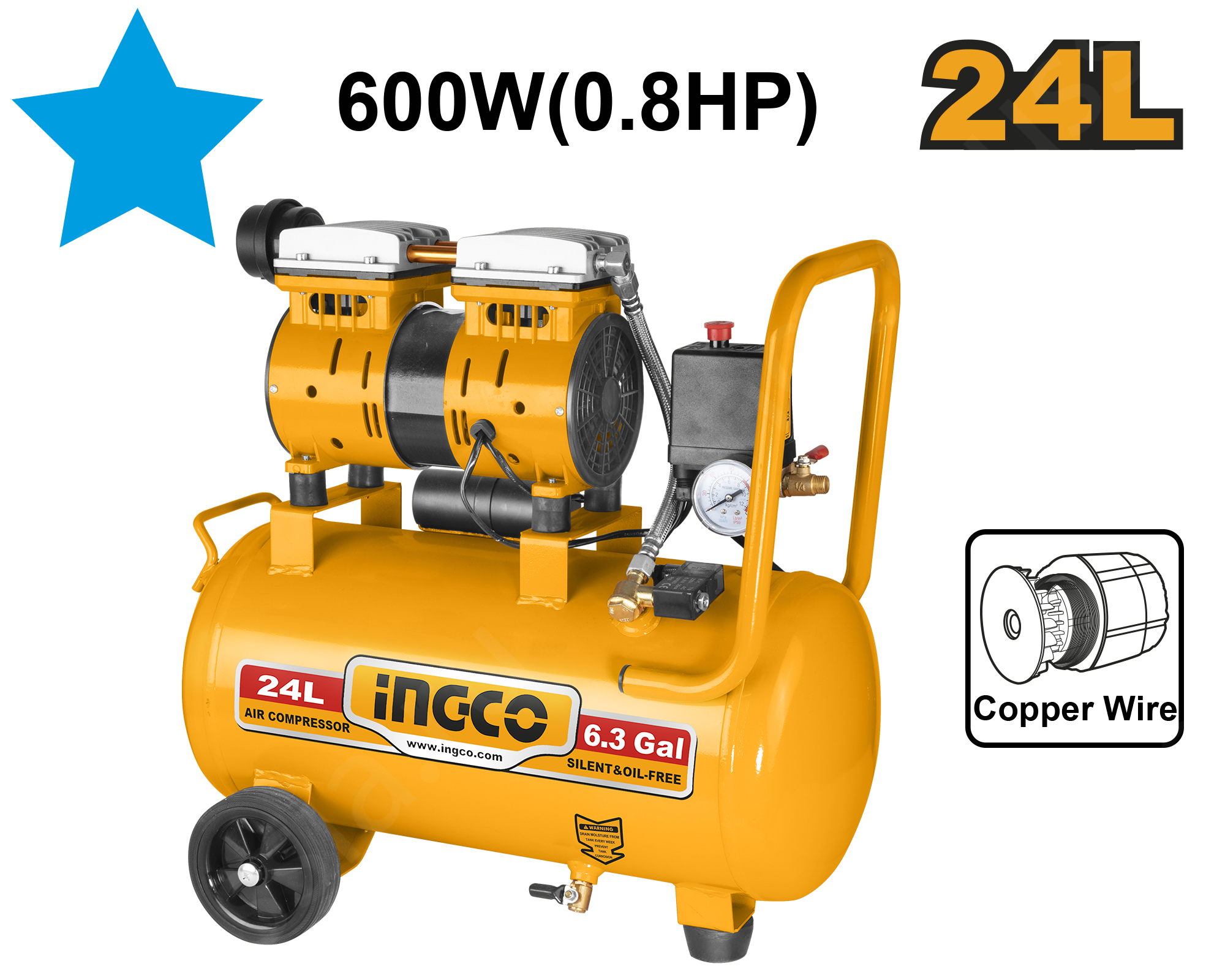 Безмасляный компрессор воздушный INGCO ACS175241 служит для нагнетания сжатого воздуха в пневматические инструменты.