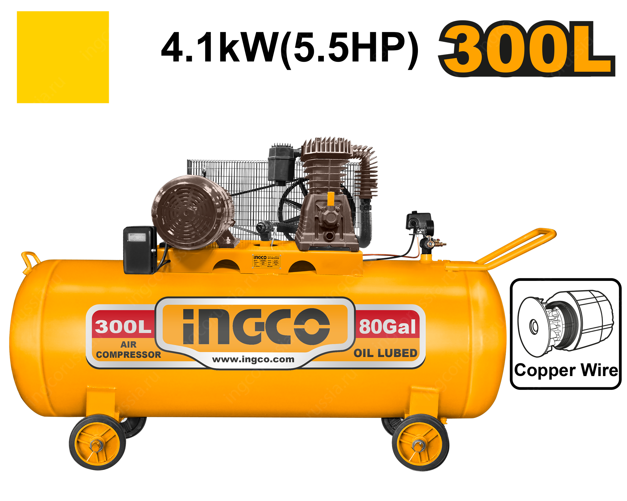 Компрессор 4,1 кВт 300 лит. INGCO AC553001 INDUSTRIAL с ременным приводом используется на производствах для питания сжатым воздухом профессионального пневматического оборудования.