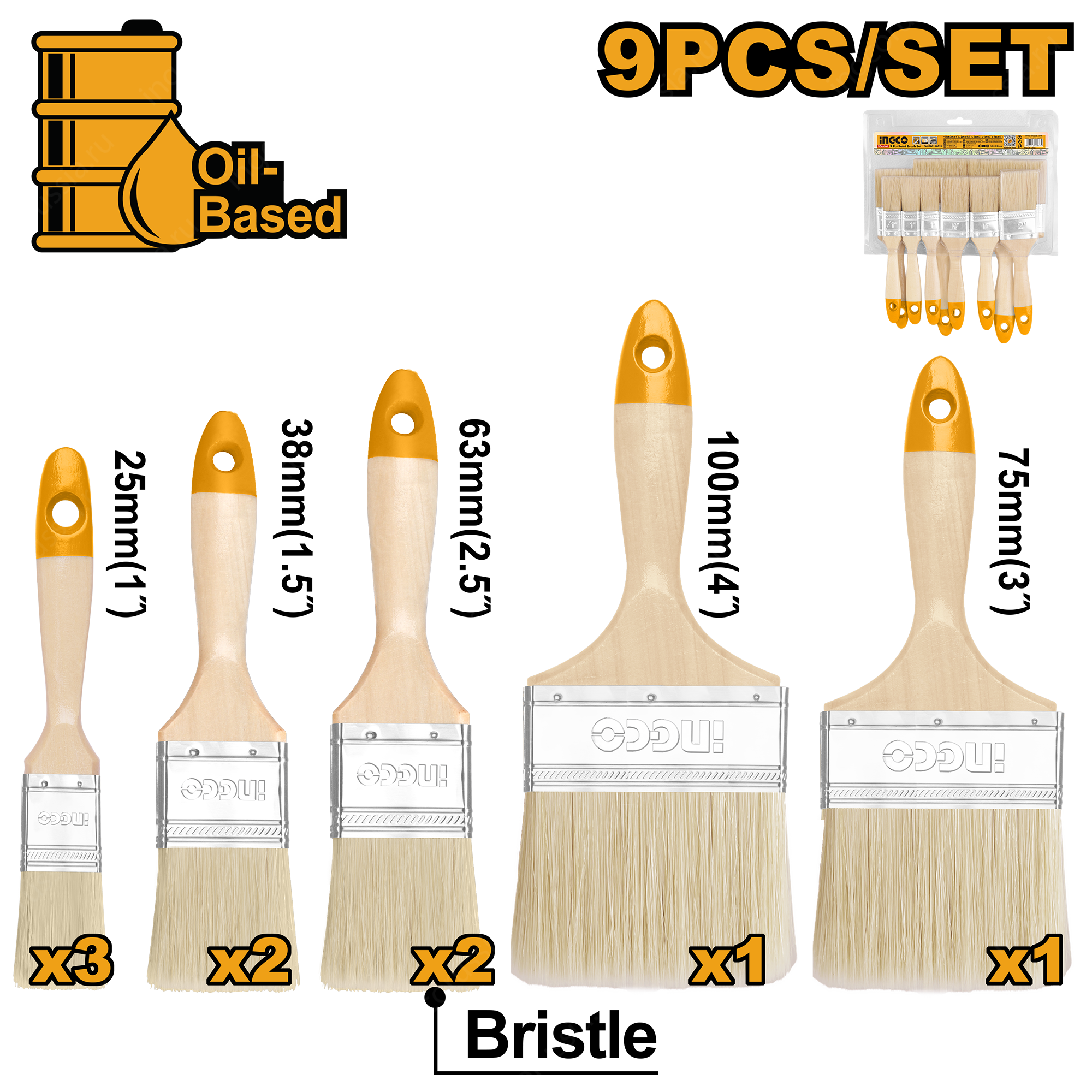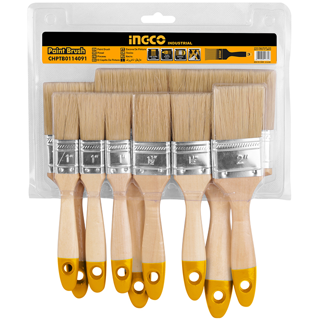Набор малярных кистей INGCO CHPTB0114091 подходит для нанесения лакокрасочных покрытий на масляной основе. Металлический бандаж надежно фиксирует щетину и не дает ей рассыпаться. В набор входят 9 флейцевых кистей с деревянной рукояткой: 3 шт - 1", 2 шт - 1,5", 2 шт - 2", 1 шт - 3", 1шт - 4".