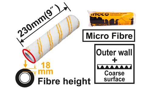Сменный ролик для валика INGCO HRC3323018 из микрофибры. Высота ворса - 18 мм. Ширина валика - 230 мм. Для отделки наружных стен.