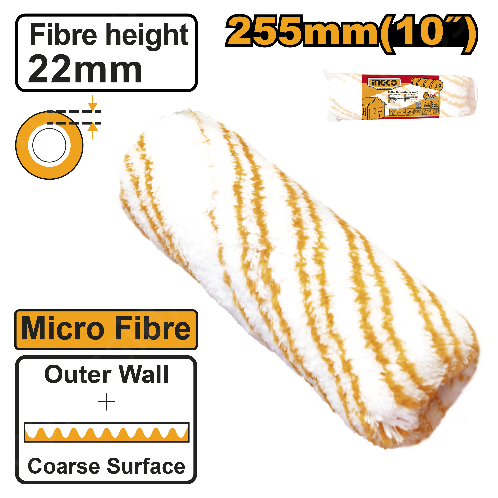 Сменный ролик для валика INGCO HRC0925522 из полиакрила. Высота ворса - 22 мм. Ширина валика - 255 мм. Для отделки наружных стен.