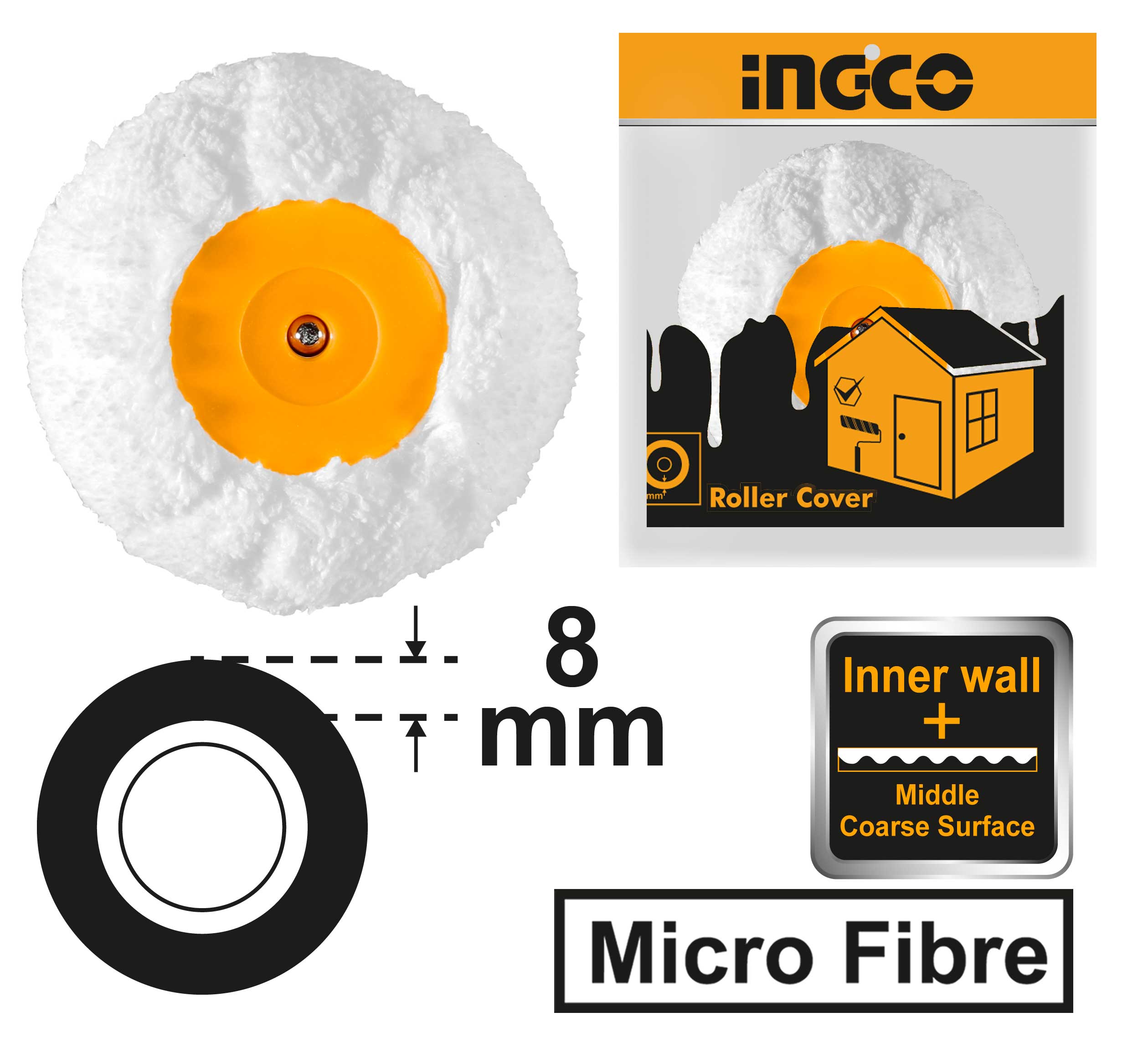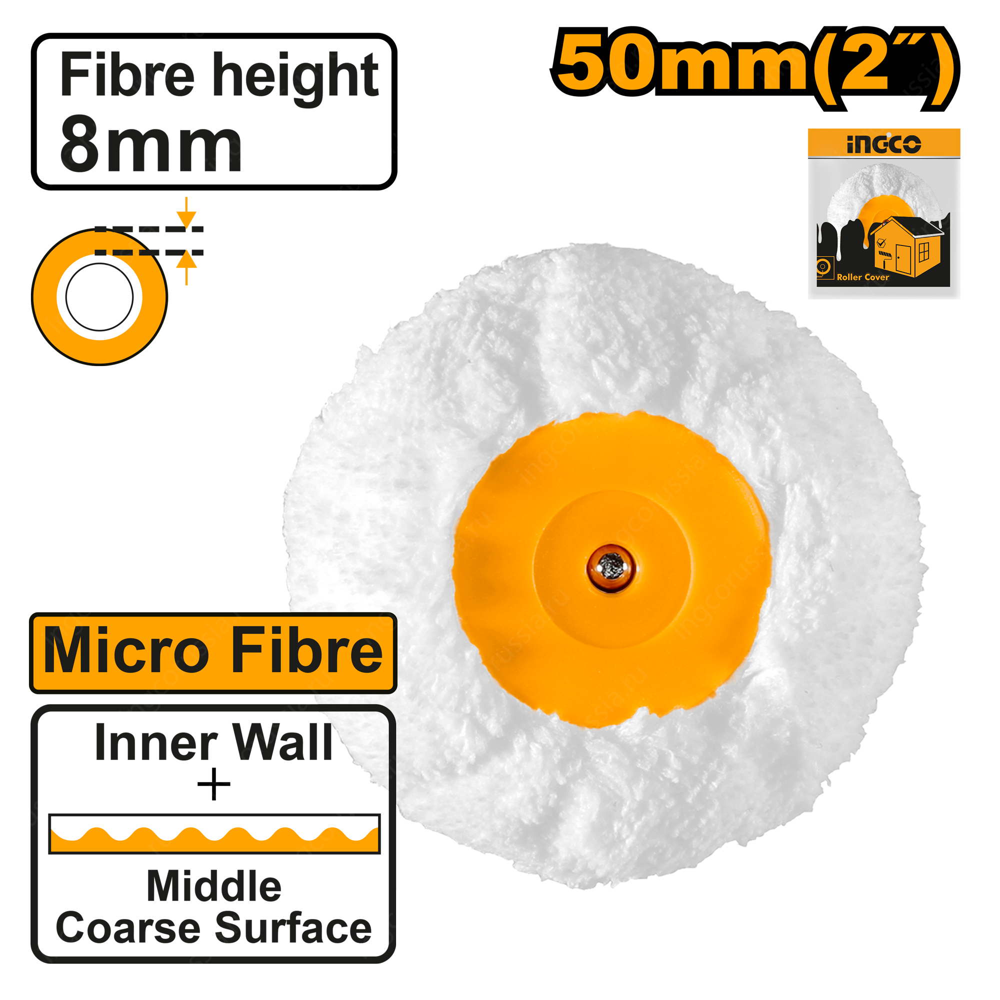 Сменный ролик для валика INGCO HRC3305008 из микрофибры. Высота ворса - 8 мм. Ширина валика - 50 мм. Для отделки внутренних стен.
