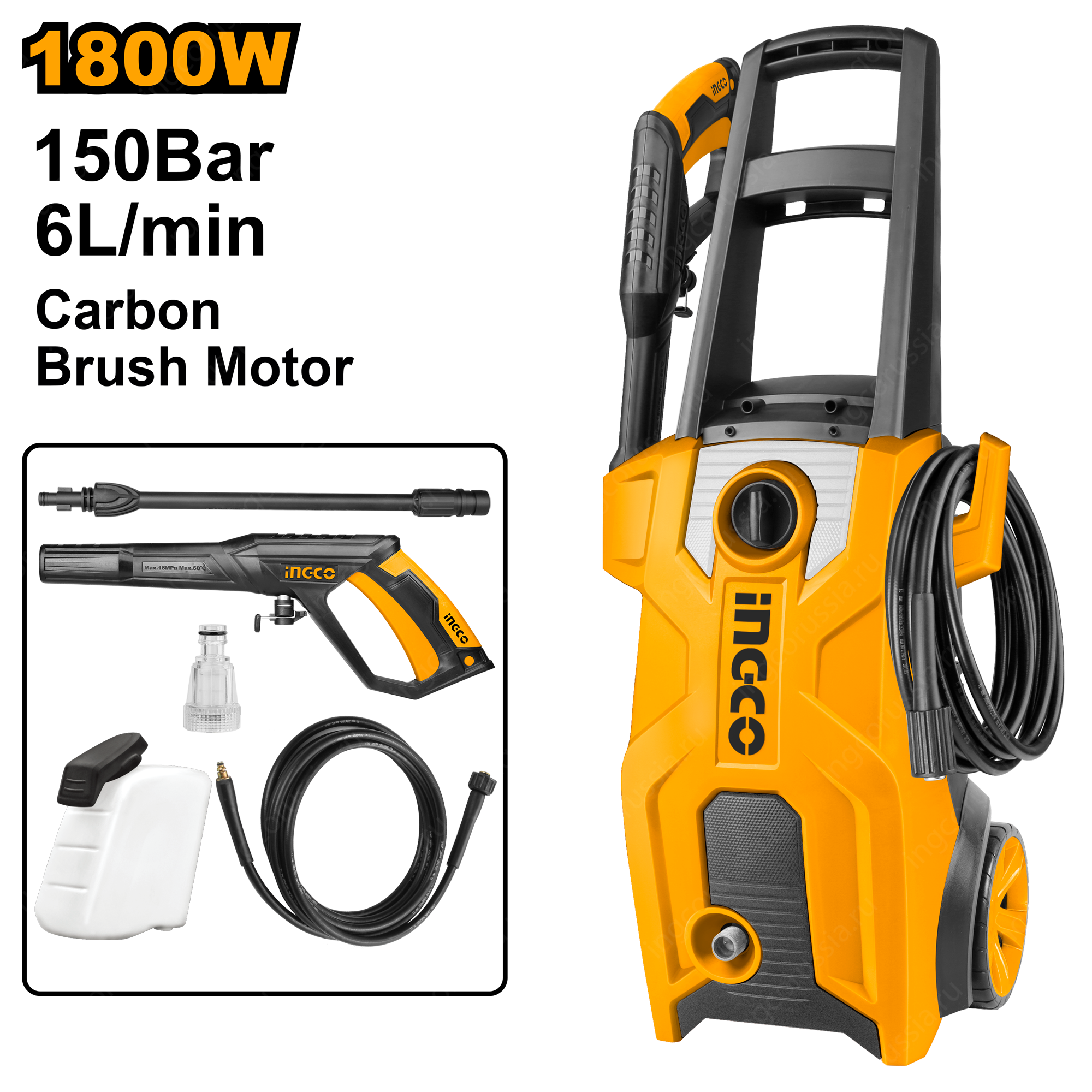 - В комплекте: бутылка для мыла, 1 пистолет, 5 метров шланга высокого давления