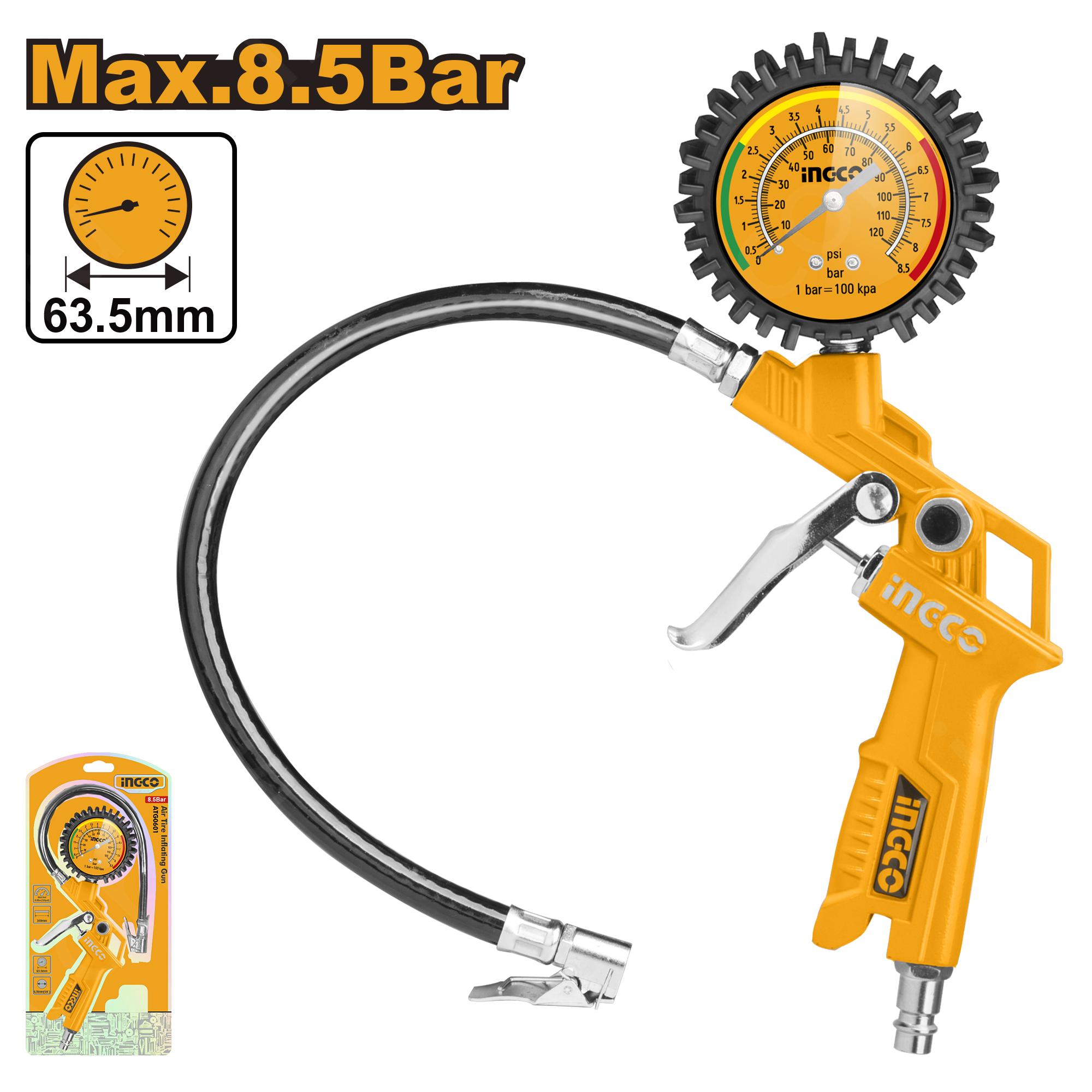 Пистолет для подкачки шин 8,5 Bar INGCO ATG0601 используется в шиномонтажных или домашних мастерских.
