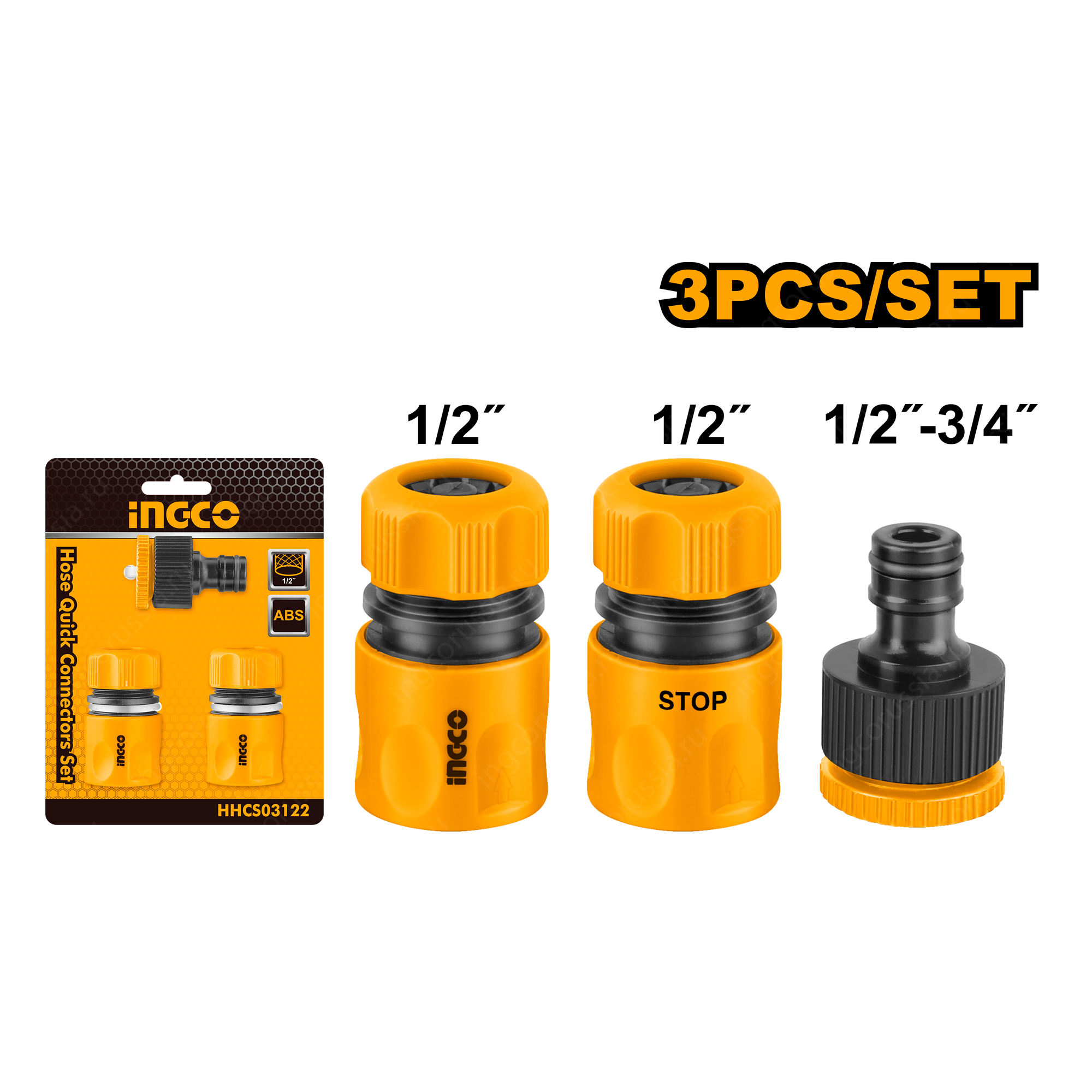 Набор соединителей для шлангов 3 шт 1/2" INGCO HHCS03122 состоит из двух коннекторов 1/2'' и штуцера 1/2'' - 3/4''.