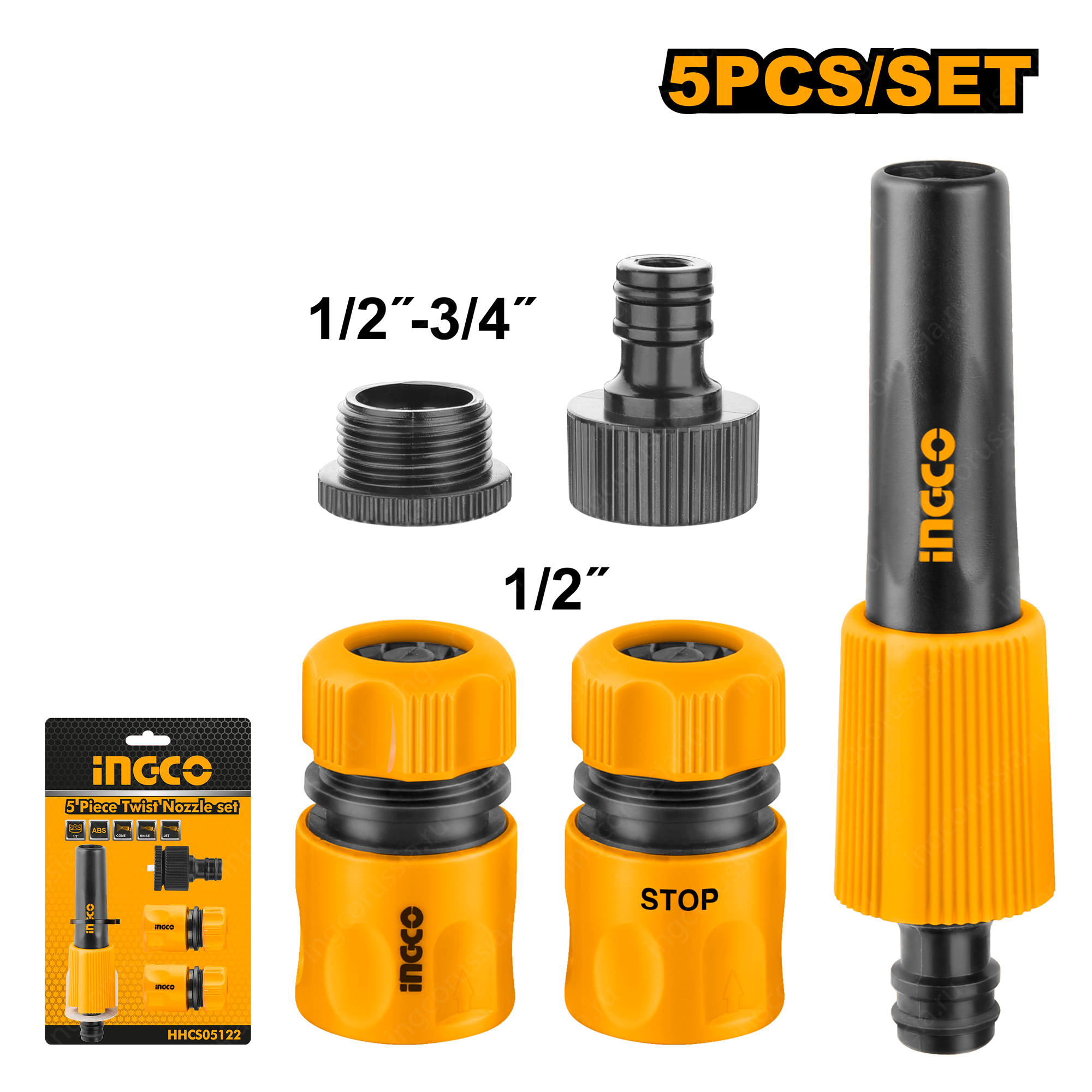 Набор соединителей для шлангов 5 шт 1/2" INGCO HHCS05122 состоит из двух коннекторов 1/2'', штуцера 1/2'' и насадки для шланга.