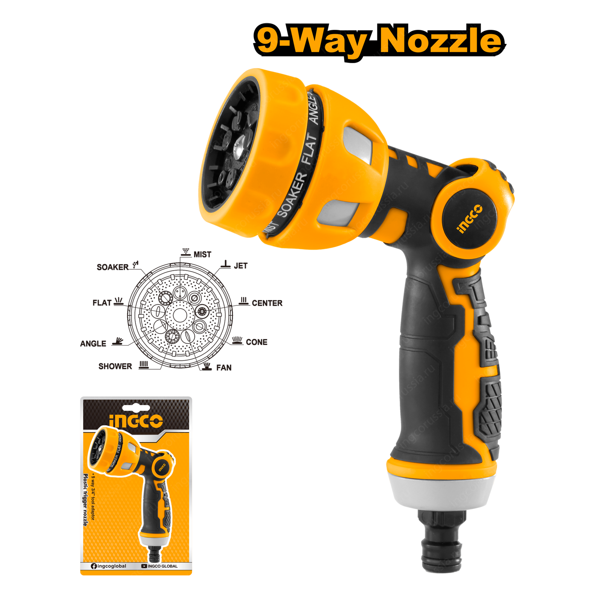 9 режимов струи, в том числе душ, угол, центр, веер, конус, струя, туман, впитывающая жидкость, плоская.