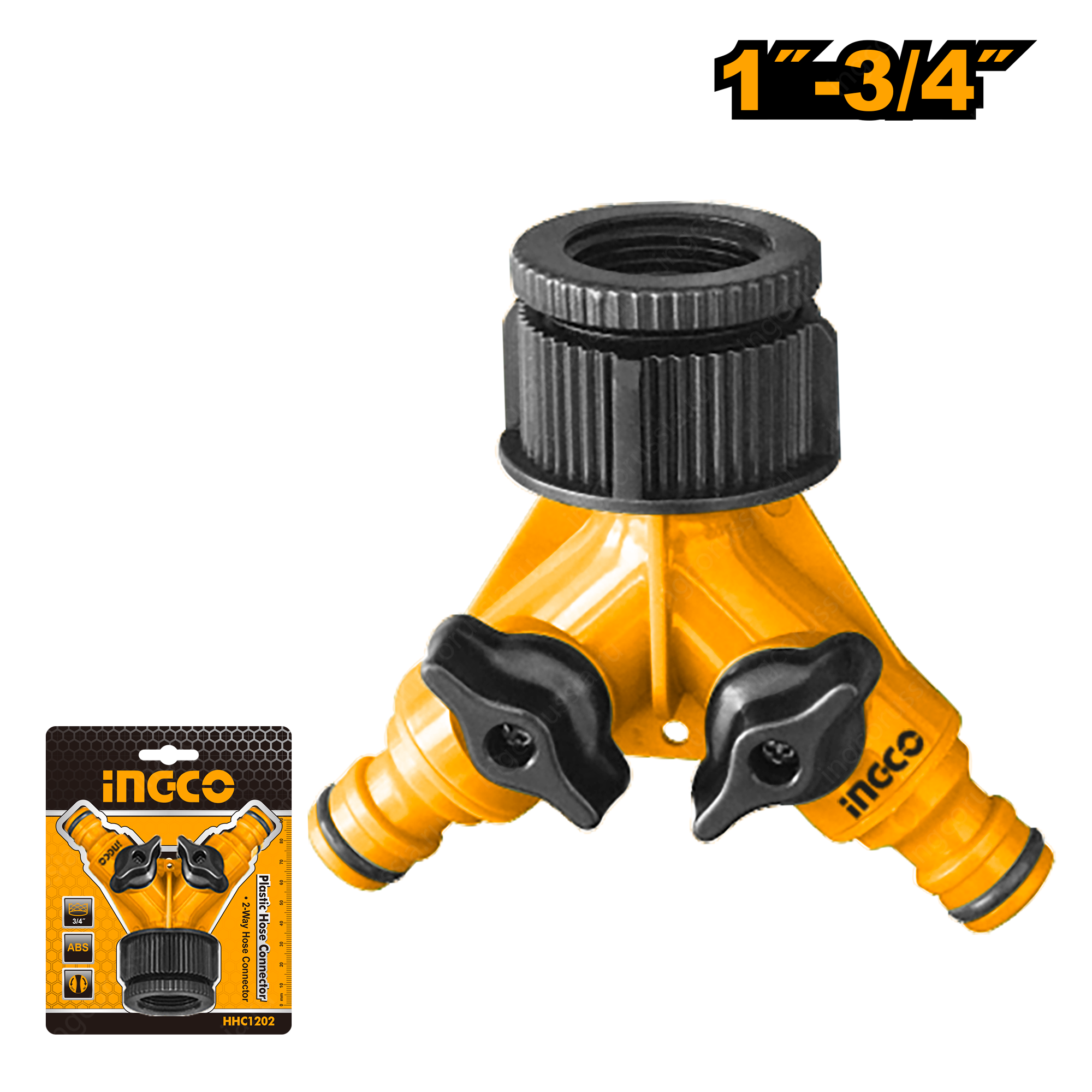 Распределитель двухканальный 1"-3/4" INGCO HHC1202 предназначен для разветвления подачи воды в шланге при поливе.