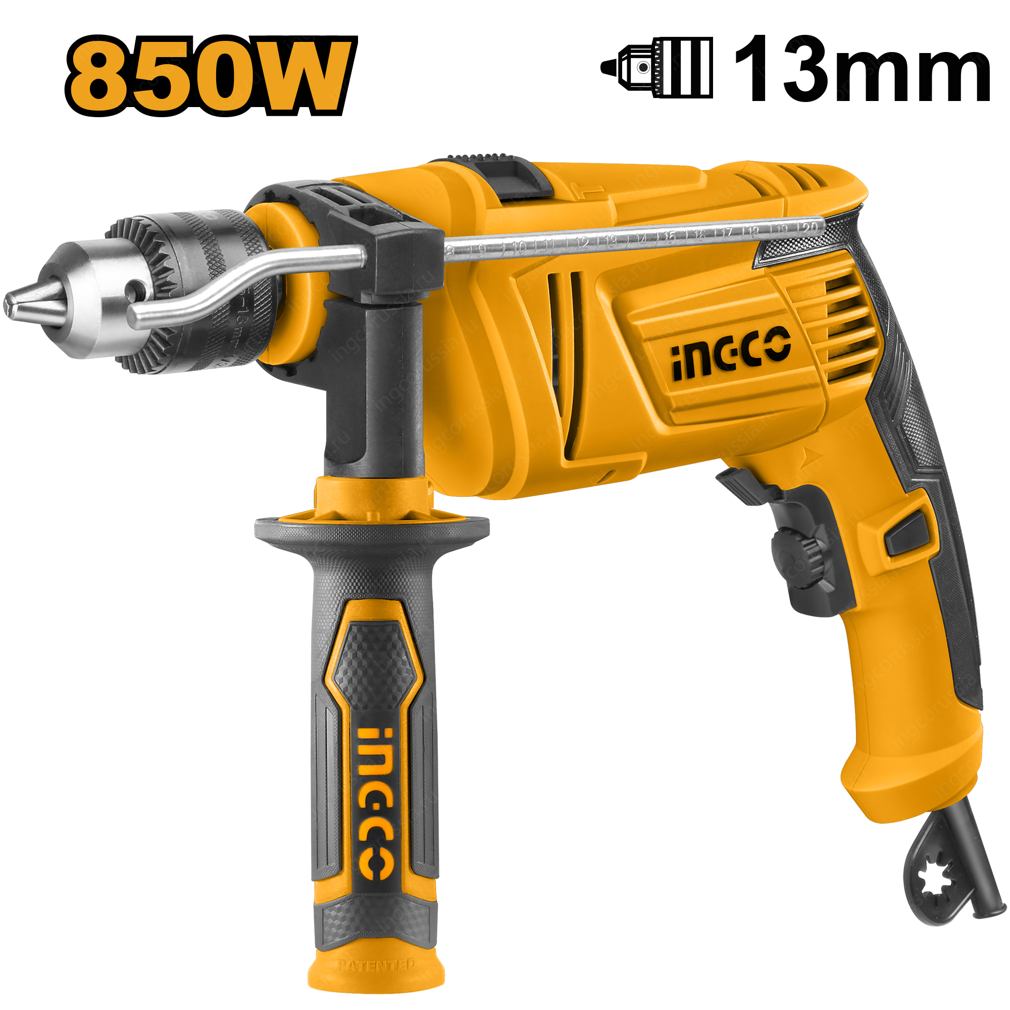 Дрель INGCO ID8508 снабжена ограничителем глубины сверления, электронной регулировкой частоты вращения, реверсом. Для удобства пользования инструментом дрель оборудована дополнительной рукояткой.