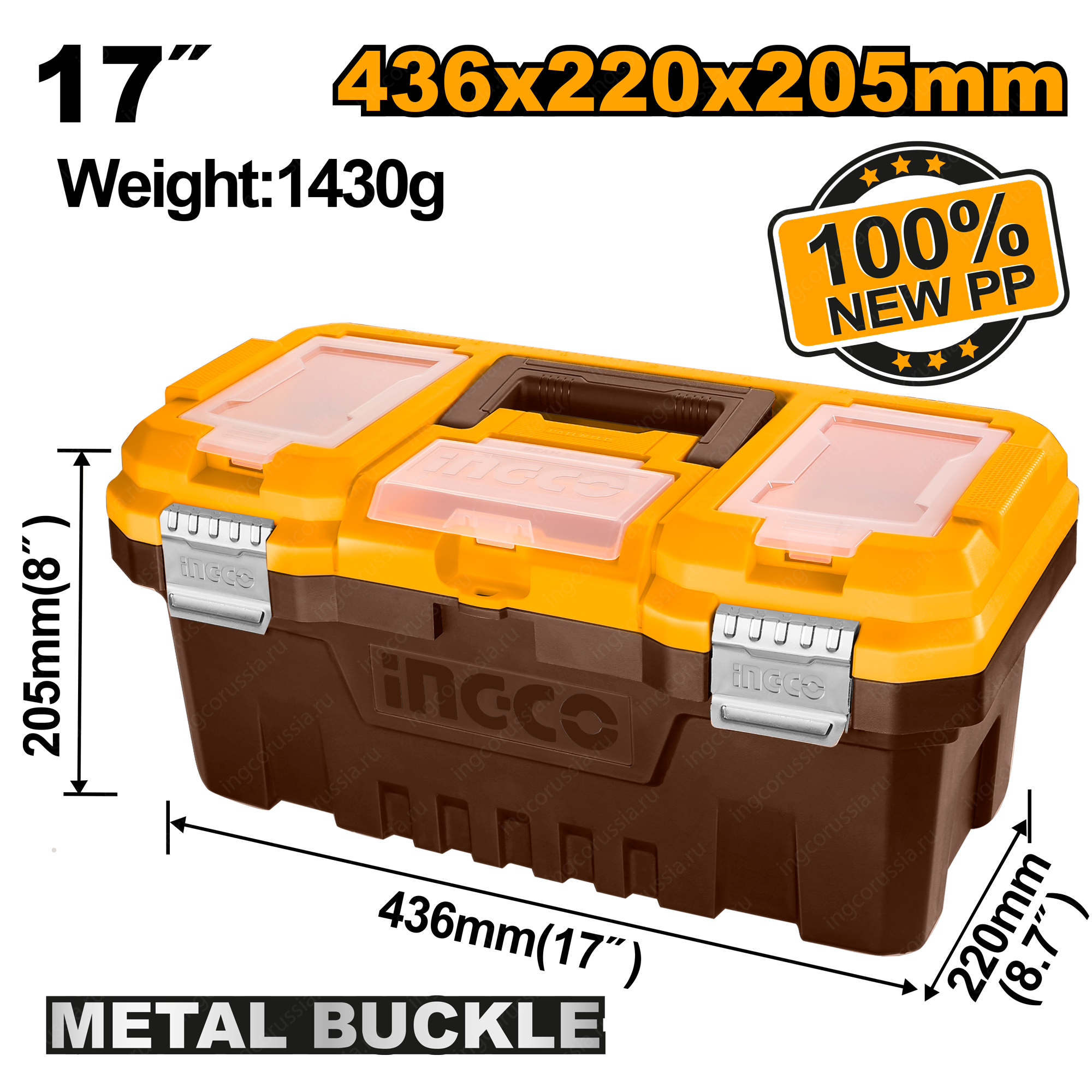 Пластиковый ящик для инструмента 205х436х220 мм INGCO PBX1702 содержит одно большое отделение и три отделения на крышке для мелочей. Максимальная загрузка - 15 кг.