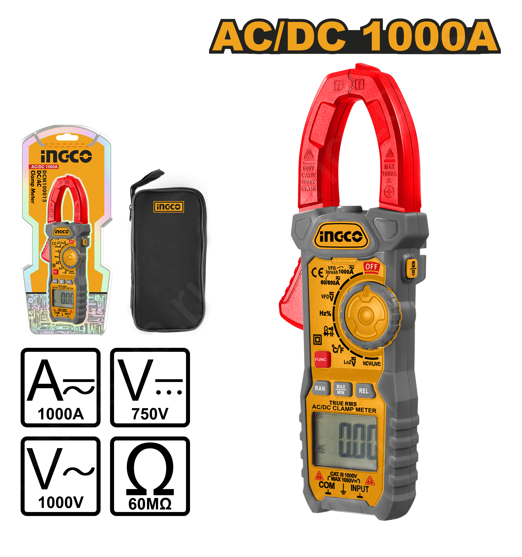 Переменный ток: 60A/600A/1000A±(2,5% +8)
