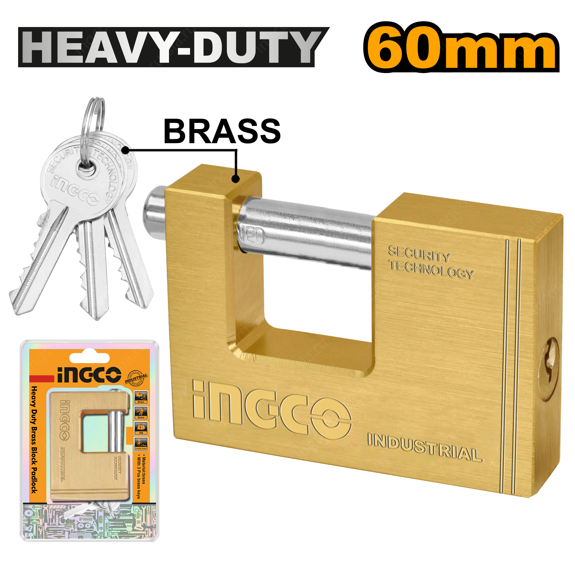 Замок навесной 60 мм INGCO DBBPL0602. Материал замка - латунь. В комплекте 3 ключа.